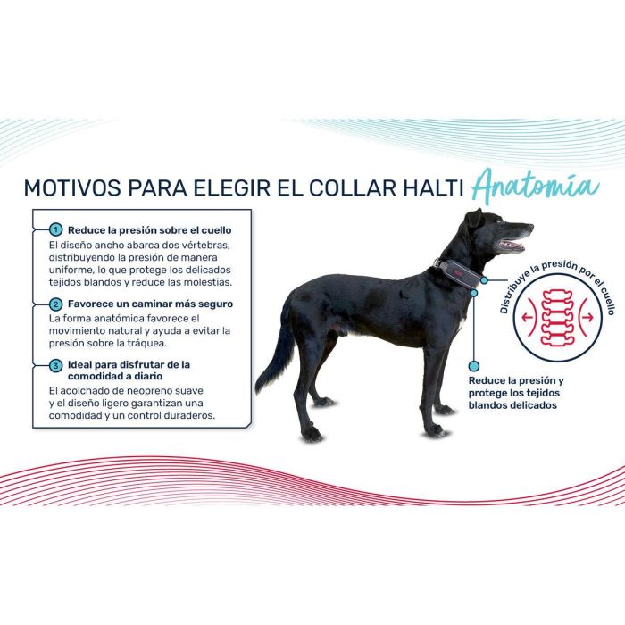 El collar Halti Anatomy es un collar de primera calidad, recomendado por los veterinarios, que se ha diseñado con cuidado anatómico. Su forma más ancha abarca dos vértebras, lo que permite que la presión se distribuya de manera uniforme en el cuello. Esto ayuda a reducir la tensión sobre los delicados tejidos de la garganta y hace que los perros que tiran o son sensibles a los collares tradicionales caminen de forma saludable. Este collar, que cuenta con acolchado de neopreno, detalles reflectantes y una resistente hebilla en X, ofrece comodidad durante todo el día, un control fiable y versatilidad para el uso diario.