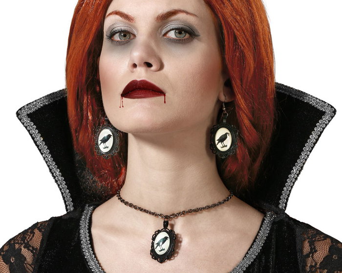 Completa tu look oscuro con este set de bisutería compuesto por collar y pendientes a juego, con diseño tipo camafeo y un cuervo como protagonista. aporta un aire misterioso y elegante a disfraces de vampiresa, bruja gótica o personajes victorianos. un complemento perfecto para halloween, eventos de cosplay o sesiones de fotos temáticas.