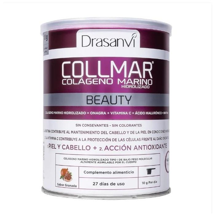 muy bajo peso molecular)8686 mg, Aroma(Aroma granada), Extracto seco de Acerola(Fruto) (Malpighia punicifolia, Vitamina C al 25%)320 mg, Aceite de Onagra microencapsulada(Semilla) (Oenothera biennis L.)250 mg, Zumo concentrado de Granada(Fruto) (Punica granatum L.)200 mg, Aceite de Borraja microencapsulada(Semilla) (Borago officinalis L.)100 mg, Remolacha(Raíz) (Beta vulgaris L.)50 mg, Ácido Hialurónico 10 mg, D- Biotina(Biotina)100 µg