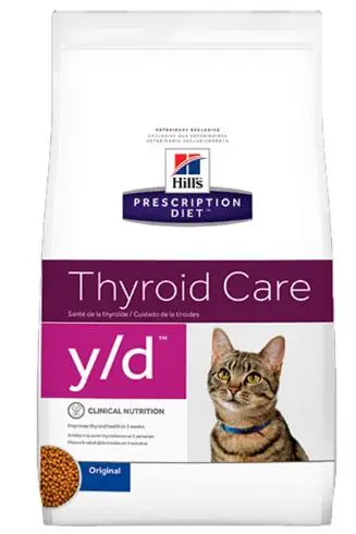 La Dieta Prescription Diet Feline y/d de Hill's es un alimento completo y equilibrado especialmente formulado para el manejo nutricional del hipertiroidismo en gatos adultos. Este alimento seco y húmedo ayuda a normalizar la producción de la hormona tiroidea T4 gracias a sus niveles de yodo limitados.