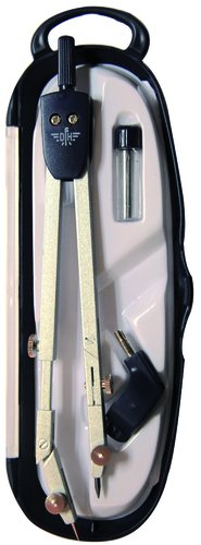 Estuche compás de 150 mm, de longitud. Realiza circunferencias hasta 195 mm. Ambos brazos articulados. Con alargadera telescópica incorporada, adaptador universal y tubo de minas. Presentado en estuche.