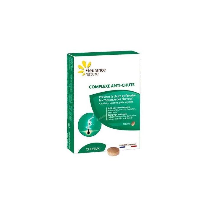 Indicaciones: El COMPLEJO ANTI-CAÍDA es un suplemento que contiene extractos de activos naturales que pueden ayudar en caso de caída del cabello, como el capilar de Montpellier para prevenir la caída, la cola de caballo para promover el crecimiento y el arándano para activar la microcirculación del cuero cabelludo. También contiene zinc, selenio y vitamina B8 para promover el mantenimiento del cabello normal, así como vitaminas B2, B6, B12 y magnesio que ayudan a reducir la fatiga, a menudo una de las causas de la pérdida del cabello. La queratina, componente principal del cabello, también complementa la fórmula, al igual que la cistina y la metionina, dos aminoácidos sulfurados que participan en la síntesis de la queratina.