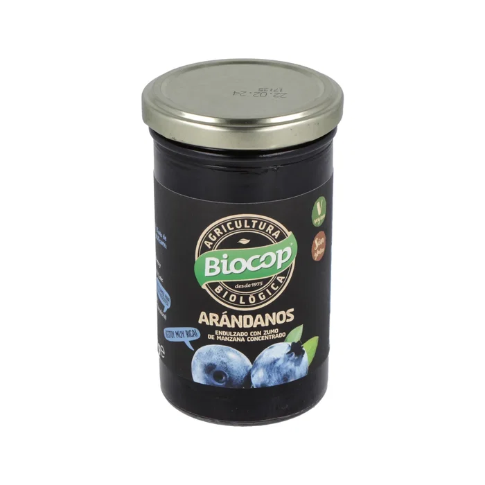 Indicaciones: Compota de arándanos. Elaborada con arándanos maduros mediante cocción mínima para garantizar todo el sabor y aroma de la fruta. Endulzada con concentrado de zumo de manzana. Alimento vegano.