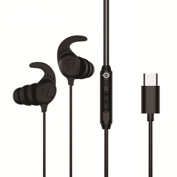 Conceptronic Brendan05B Auriculares In-Ear USB-C con Micrófono, Sonido Hi-Fi, Ganchos de Silicona, Cable 1.2m, Negro