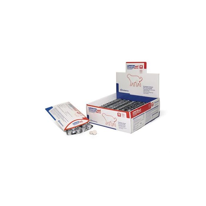 - COMPOSICIÓN: Glucosamina HCl (pureza >99%) 950 mg, Condroitín Sulfato (pureza 100%) 700 mg , Ácido Hialurónico Mobilee® 30 mg , Colágeno nativo tipo II b-2Cool® 8 mg , Vitamina E (DL-?-tocoferol acetato al 50%)) 20 mg. POSOLOGÍA:Perros 25-40 kg, 1 comp. Perros 40-60 kg, 2 comp. Administrar durante 40 días, y repetir la pauta 2-3 veces al año a criterio veterinario. En casos crónicos y en función de los signos clínicos, tras la administración de 40 días, aplicar pauta de mantenimiento reduciendo la dosis a la mitad. INDICACIONES: Perros con artrosis y procesos degenerativos del cartílago articular debidos a: edad avanzada, ejercicio elevado y sobrepeso. Después de cirugía articular o afecciones postraumáticas, para asegurar una mejor recuperación del animal.