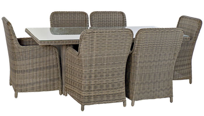 DKD Home Decor Mesa de Comedor para Terraza y Jardín, Set de 7 Piezas en Ratán Sintético y Acero con Cristal, Color Beige y Gris, Dimensiones 200 x 100 x 75 cm, Incluye Cojines