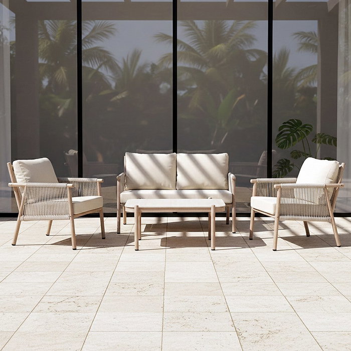 Conjunto Jardín Salina Acero-Rattán Pe 1 cm Incluye 1 Sofá (127X69X80 cm), 2 Sillones (67X69X80 cm) y 1 Mesa Centro (90X68X42,5 cm). Estructura de Acero y Pe Ratán. Tablero de La Mesa de Piedra Sinterizada. Tejido 100% Olefina. Relleno de Foam y Polifibra.