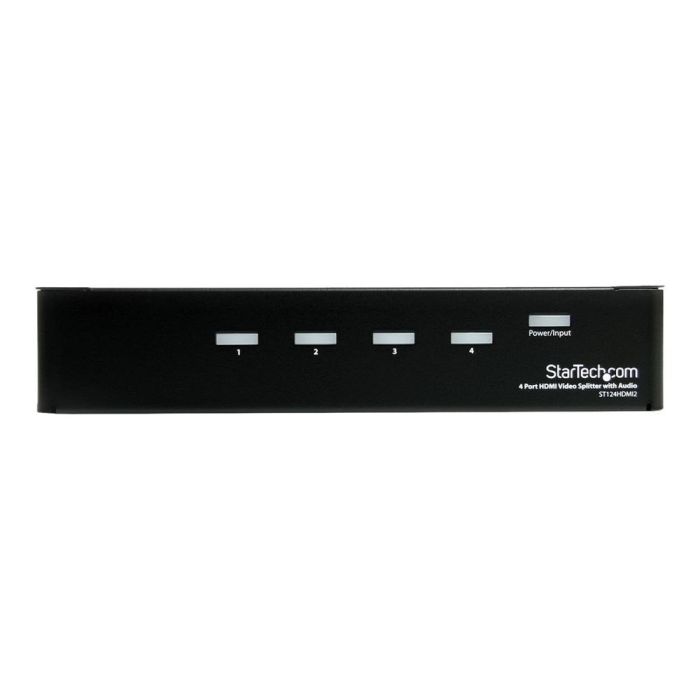 El multiplicador HDMI ST124HDMI2 de Startech es un conmutador HDMI diseñado para distribuir una señal de audio y vídeo de alta definición a múltiples pantallas simultáneamente, permitiendo conectar hasta 4 monitores o receptores con entrada HDMI o DVI-D sin pérdida de calidad en la imagen ni en el sonido. Este equipo compacto y robusto, con carcasa de acero negro y dimensiones de 135 mm de ancho por 220 mm de profundidad y 44 mm de altura, se destaca por ofrecer soporte para resoluciones de vídeo HD de hasta 1080p (1920 x 1200 píxeles), garantizando una reproducción clara y nítida, ideal para instalaciones profesionales en entornos que requieren alta fidelidad visual. El splitter incluye soportes de montaje integrados, facilitando una instalación ordenada y segura en paredes o superficies, lo que contribuye a una gestión eficiente del espacio y del cableado. Además, permite conectar pantallas situadas a una distancia máxima de 15,2 metros desde el dispositivo, gracias a su amplificador de señal integrado. En cuanto al audio, el ST124HDMI2 ofrece flexibilidad al contar con conexiones separadas de audio de 3,5 mm, posibilitando la transmisión del sonido tanto a través del canal HDMI como mediante una salida estéreo independiente, adaptándose así a diferentes configuraciones de sistemas de sonido externos. Este divisor opera con un rango de voltaje de entrada de 100 a 240 V AC y suministra una salida de 12 V para garantizar la estabilidad energética necesaria para un funcionamiento continuo y fiable. El conmutador se beneficia de la garantía y calidad tecnológicas propias de Startech, reconocido por sus soluciones de conectividad profesional que combinan funcionalidad y durabilidad. En definitiva, el ST124HDMI2 es una herramienta versátil y eficaz para cualquier aplicación que precise distribuir señales HDMI con calidad digital, ofreciendo una solución técnica avanzada y fácil de instalar para entornos audiovisuales exigentes.