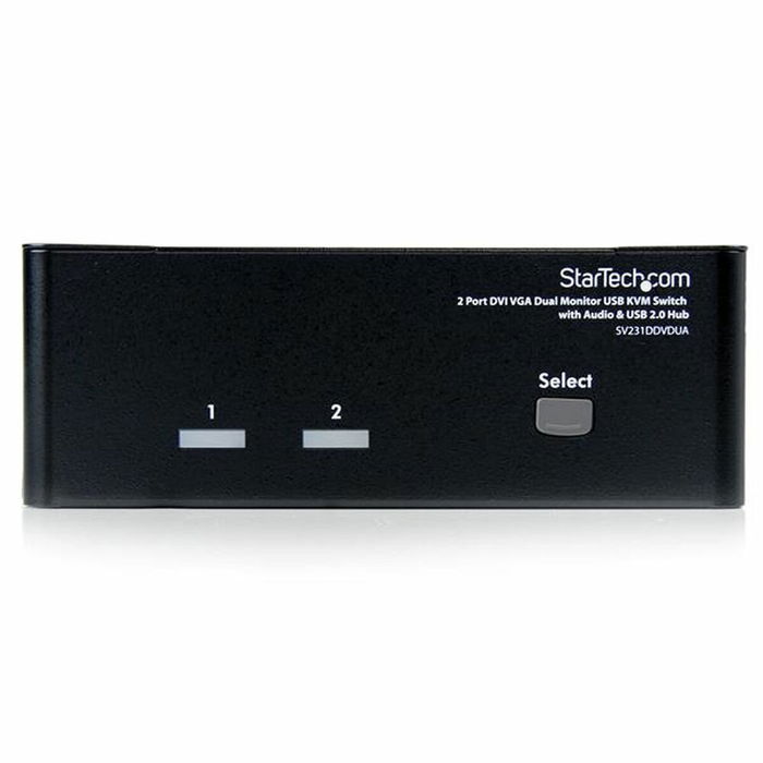 El conmutador KVM con 2 puertos SV231DDVDUA de Startech es un dispositivo diseñado para facilitar la gestión de dos ordenadores desde una única estación de trabajo, permitiendo compartir de forma sencilla y eficiente un teclado, un ratón USB y un único conjunto de pantallas para una experiencia multitarea mejorada. Su distintiva capacidad para soportar un monitor dual mediante interfaces VGA analógico y DVI-I digital ofrece una solución completa para usuarios que requieren visualizar simultáneamente dos señales de video en alta resolución, con un máximo de 1920 x 1200 píxeles. Este conmutador cuenta con un robusto chasis metálico de color negro que garantiza durabilidad y un diseño compacto ideal para cualquier entorno profesional o de oficina. Gracias a su concentrador integrado con 4 puertos USB 2.0, permite también compartir periféricos adicionales, evitando la duplicación de equipos y facilitando la conectividad de dispositivos USB externos, todo ello con compatibilidad plug-and-play y sin necesidad de configuración compleja. Además, dispone de la capacidad para conmutar el audio entre los ordenadores conectados, facilitando así un control completo del sonido asociado a cada fuente. Su fuente de alimentación admite un rango de voltaje de 100-240 V con un consumo eficiente de 0,8 A, proporcionando alimentación estable y segura para un funcionamiento continuo. Los indicadores LED incorporados ofrecen información visual clara sobre el estado de la alimentación y la actividad del dispositivo. Este modelo está certificado bajo el estándar RoHS, asegurando el cumplimiento de normativas ambientales vigentes. La combinación de soporte para video analógico y digital, junto con la integración USB, convierten a este conmutador KVM en una herramienta versátil y confiable para profesionales que demandan control simultáneo y sin complicaciones de múltiples ordenadores multimedia en entornos exigentes.