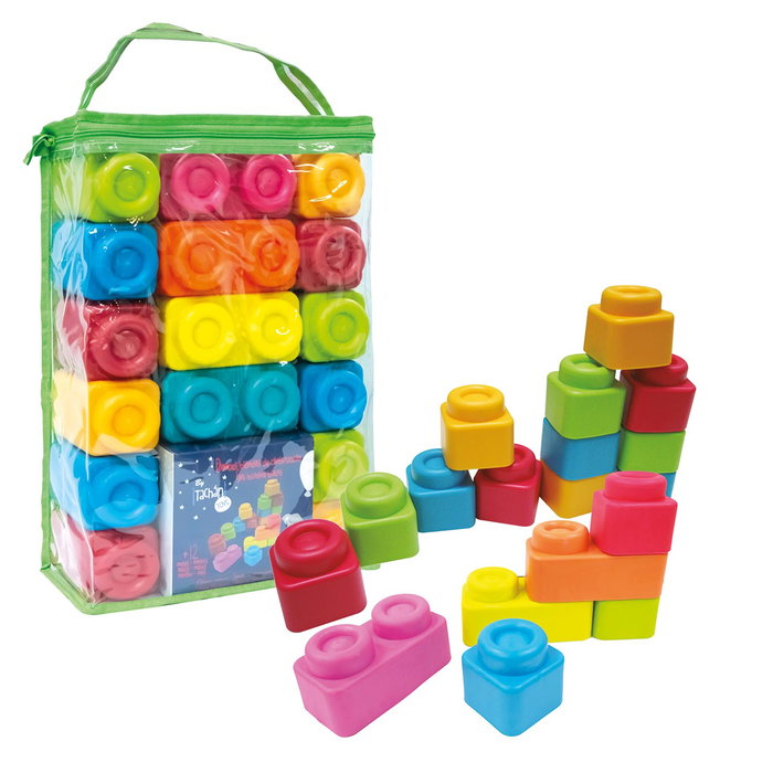 Construcciones blandas con forma de bloques. Incluye 36 piezas para realizar construcciones de todo tipo. déjate llevar por tu creatividad e imaginación para crear piezas únicas. Viene en una bolsa de plástico con cremallera para poder guardarlo todo después de jugar y optimizar el espacio. Recomendado para mayores de 2 años.