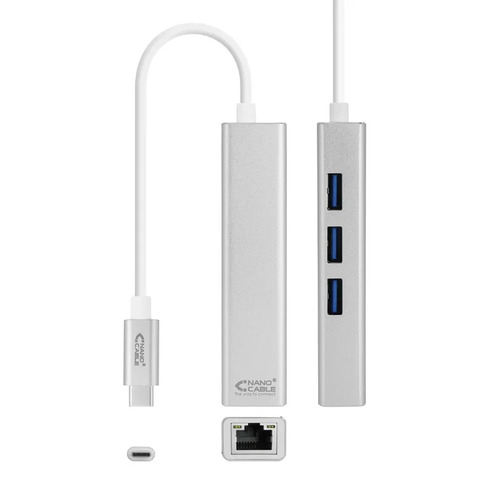 Conversor USB-C a Ethernet Gigabit con 3 puertos USB 3.0, con conector USB-C macho en un extremo, conector RJ45 hembra y 3 puertos USB 3.0 hembra en el otro.