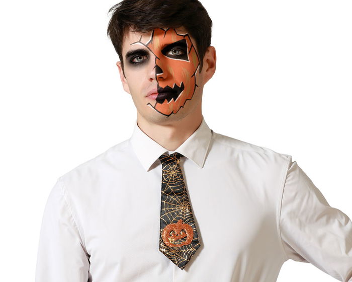 Esta corbata combina el negro clásico con una simpática calabaza, creando el complemento perfecto para disfraces originales de halloween. ideal para personajes cómicos, maestros del terror o zombis con traje.