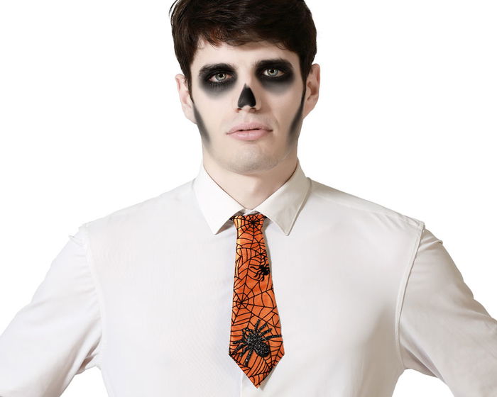Esta corbata es el complemento perfecto para disfraces creativos de halloween. su diseño naranja con motivos arácnidos aporta un aire temático y divertido para personajes de oficina embrujada, monstruos cómicos o profesores locos.