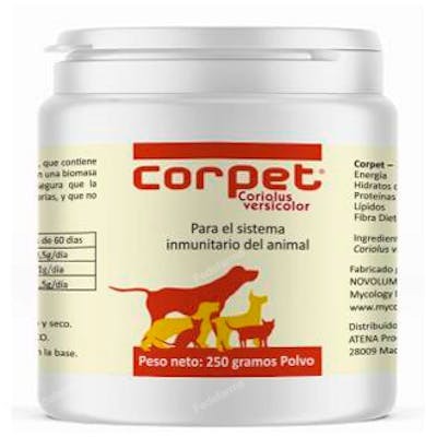 Indicaciones: Corpet (Coriolus versicolor) se utiliza para apoyar al sistema inmune de perros, gatos y equinos, bajo supervisión de veterinarios. Este producto es hipoalergénico. Proceso de cultivo libre de contaminación por otros hongos y ausencia de e.coli, y metales pesados (pesticidas). Patentado, permitiendo una producción estandarizada de Coriolus versicolor.