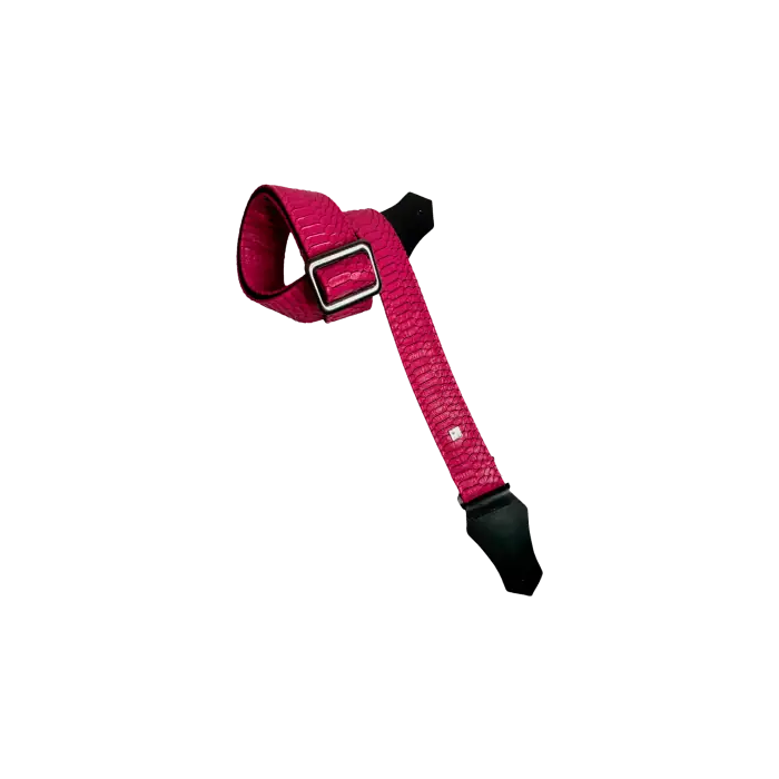 - Categoría: correa - Instrumento: guitarra, bajo - Material: polipiel, nailon, cuero - Tapicería: piel sintética grabada con estampado de serpiente - De color rosa - Largo: ajustable hasta 165 cm
