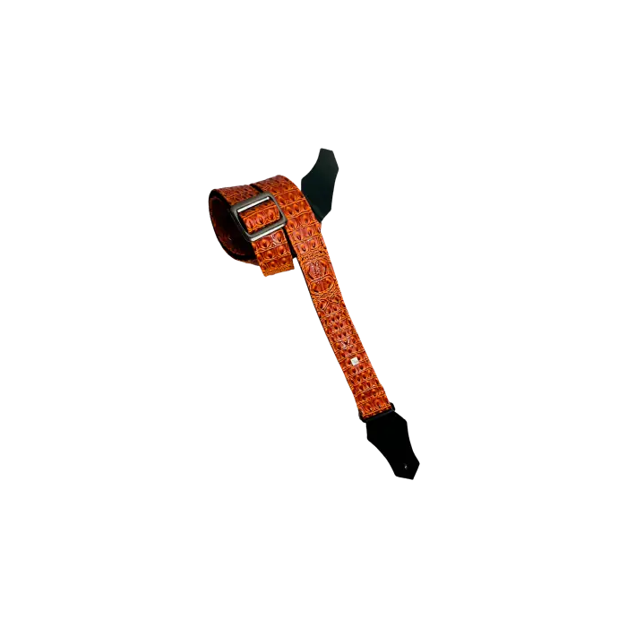 - Categoría: correa - Instrumento: guitarra, bajo - Material: polipiel, nailon, piel - Tapicería: piel sintética grabada - Colores: tonalidades que van del naranja tostado brillante al ocre oscuro - Largo: ajustable hasta 165 cm