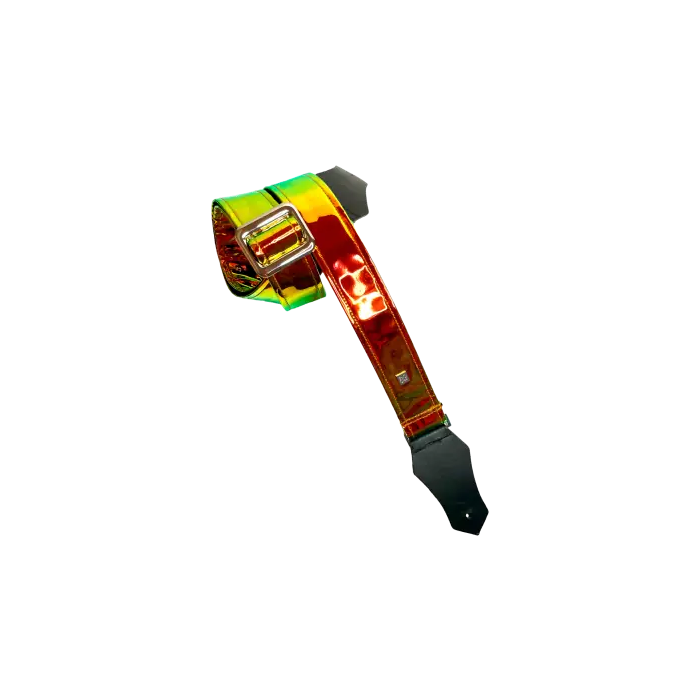 - Categoría: correa - Instrumento: guitarra, bajo - Material: piel sintética, piel, vinilo - Revestimiento: vinilo cromado holográfico - Colores: tonos vivos de verde y naranja - Largo: ajustable hasta 165 cm
