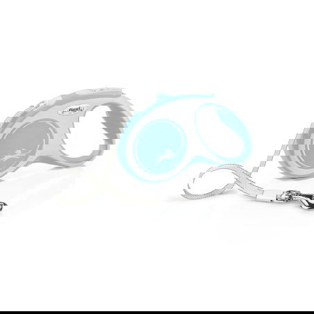 Flexi - Correa New Comfort Cinta 5 m para Perros hasta 15 kg, Sistema de Iluminación LED, Disponible en Cordón o Cinta, Ideal para Paseos con Control, Frenos y Multi Box, Azul Claro