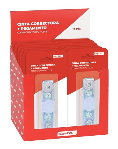 Cinta correctora retráctil más pegamento. Medidas expositor: 185 x 155 x 170 mm.