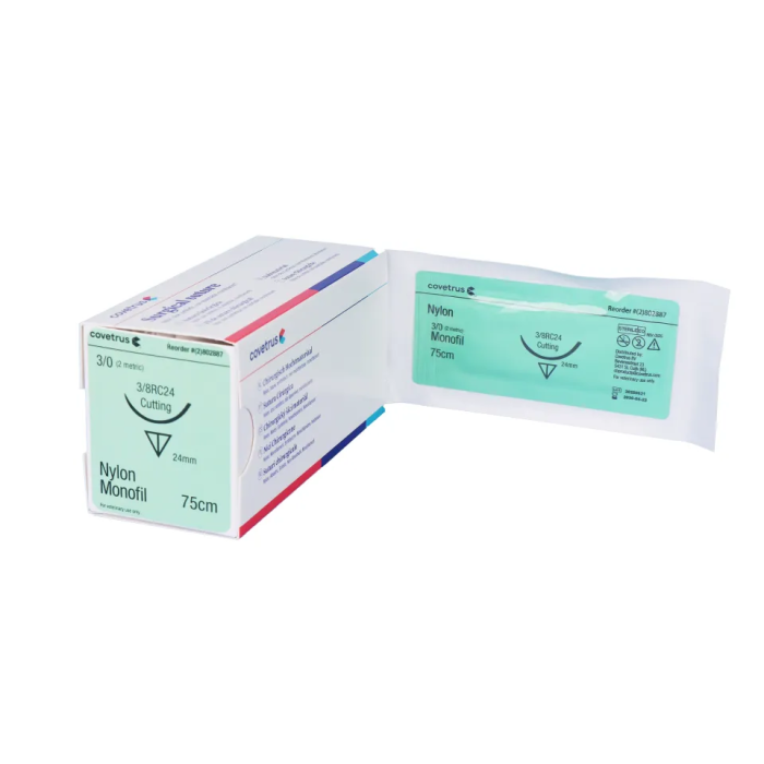 Descubre la Sutura Nylon Blue 3-8Rc30 2-0 de 75 cm de Covetrus. Este paquete incluye 12 unidades de sutura de alta calidad fabricadas en nylon de color azul. Es ideal para procedimientos quirúrgicos y de sutura que requieren un material resistente, seguro y de fácil manejo. La sutura cuenta con las especificaciones 3-8Rc30 y calibre 2-0, garantizando precisión y fiabilidad en cada uso. Confía en Covetrus, una marca líder en suministros veterinarios y médicos, para todas tus necesidades profesionales.