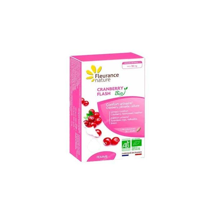 Indicaciones: Fleurance Nature ha desarrollado CRANBERRY FLASH, una fórmula orgánica a base de hierbas para las mujeres a utilizar en caso de molestias urinarias frecuentes desde los primeros signos de malestar: La pilosela es una planta que facilita las funciones de eliminación del cuerpo. La Calluna (también conocida como brezo falso y no debe confundirse con el brezo) también contribuye a las funciones de eliminación urinaria normales. La dosis recomendada de cranberry es de 36 mg de pacs (proantocianidinas). El aceite esencial de la sarrieta de las montañas está garantizado 100% puro y natural. Este producto no ha sido probado en animales, de acuerdo con la normativa europea. Este producto es adecuado para personas con una dieta vegana (vegano).