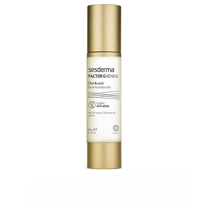 FACTOR G RENEW Óvalo facial & cuello de Sesderma es un tratamiento y crema específico para la zona del cuello y el escote. Esta crema de acción global antienvejecimiento está diseñada para redefinir el óvalo facial y reafirmar el cuello y el escote.