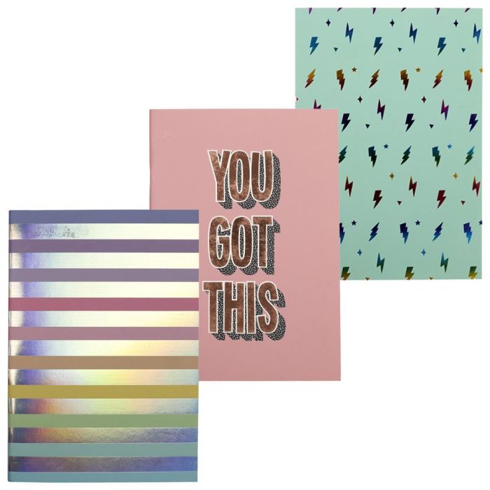 - Conjunto de 3 libretas con tapas coloridas.
