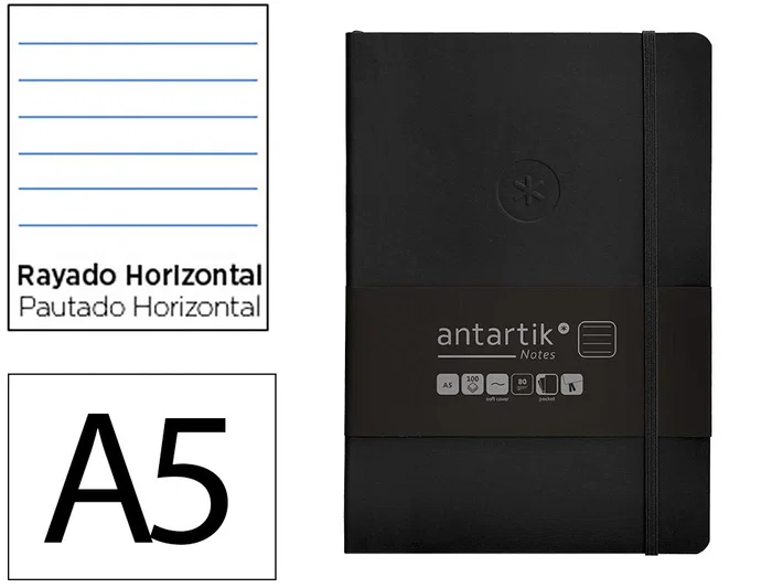 Sumérgete en el estilo de moda y práctico de la colección Antartik Notes. Este cuaderno tiene un diseño elegante con la estrella genial de Antartik impresa en relieve, dándole un toque de diseño único. Cubierto en simil piel, proporciona un tacto ultra suave. Cuenta con un cierre elástico con gomilla, 2 marcapáginas para organizar y acceder fácilmente a distintas secciones. Además, ofrece un bolsillo tipo sobre, ideal para guardar tarjetas o pequeñas notas. Antartik Notes tiene hojas de papel de alta calidad de 80 gramos y certificación FSC, ofreciendo una superficie óptima para escribir, dibujar o plasmar tus ideas creativas. La clave está en la versatilidad de su uso: desde el día a día, en el trabajo, hasta la captura de ideas,as, proyectos o creación de bocetos creativos. CARACTERÍSTICAS: Tamaño A5 TAPA BLANDA HOJAS RAYAS 80 HOJAS COLOR NEGRO 80 GR FSC ¡Descubre la gama completa de colores en Antartik Notes y encuentra el cuaderno que setu estilo!