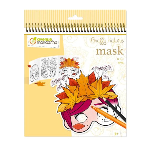 Explora la naturaleza, colorea y juega! Cuaderno de 12 hojas con 3 solapas: un modelo de color, una máscara precortada para colorear y una máscara para completar con hojas de árboles o flores y para colorear y recortar.