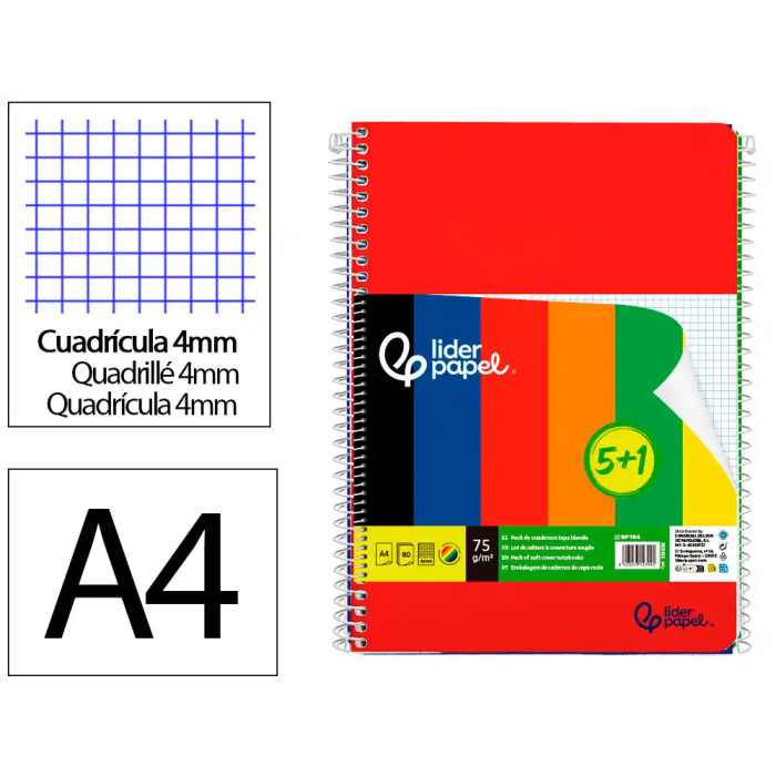 Liderpapel Cuaderno espiral A4 tapa blanda 80 hojas 75gr cuadro 4 mm con margen pack 5+1 colores surtidos