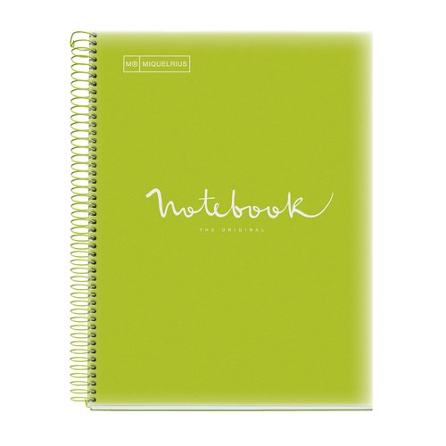 Bloc espiral con cubiertas de polipropileno impreso translúcido de 0,8 mm. Papel extra opaco microperforado de 4 taladros (incluye adhesivo explicativo removible) con 120 hojas en 5 colores distintos . Certificación: FSC Mix Credit.