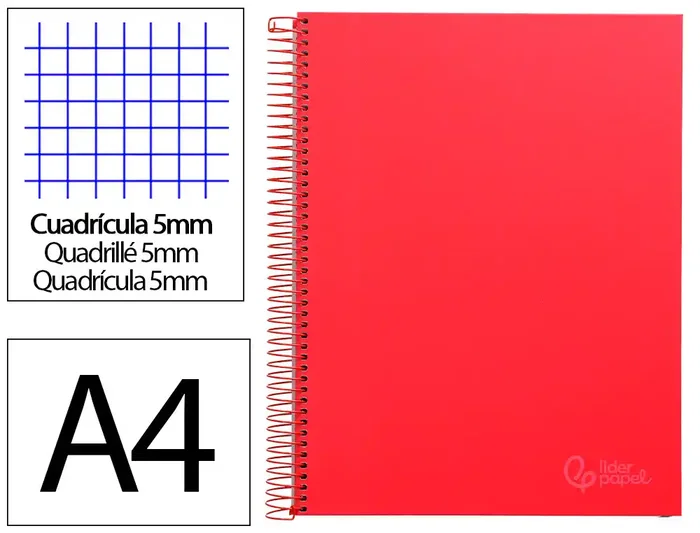 Tapa de cartón entrecolado de 1,5 mm de espesor, forrado con papel estucado mate de 135 g/m². Guarda interior blanca. Papel de 75 g/m ². Microperforado. 140 hojas. Bandas de 5 colores. Con cajetín. Espiral nylonizada. Coil-lock.