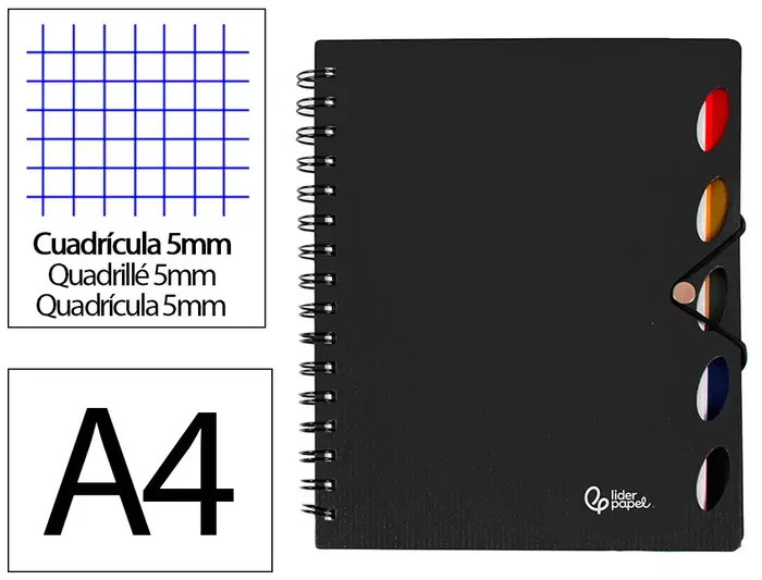 Tapa de polipropileno de 1650 micras de espesor extrarresistente metalizada. 100 hojas. Papel de 80 g/m². Cuadrícula de 5 mm. Microperforado. Doble espiral nylonizada color negro. 5 separadores intercambiables. 5 índices de color. Cierre de gomilla con elástico y sujeción metálica.
