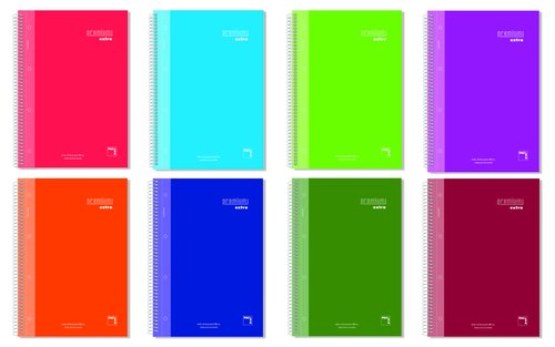 Bloc de tapa y contracubierta extra dura de cartón de 1.170 gr./m2, forrado y plastificado (código de barras y descripción impreso en la contracubierta) e interior de 120 hojas de papel extra de 90 gr./m2 microperforadas, con rayado azul y 5 bandas de color. Todo encuadernado con un espiral de alambre blanco nylonizado con coil-lock.