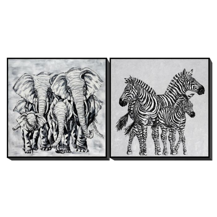 DKD Home Decor Cuadro Colonial Blanco Negro 3.5 x 100 x 100 cm (2 Unidades) Lienzo Ps Elefantes Cebra Hecho a mano