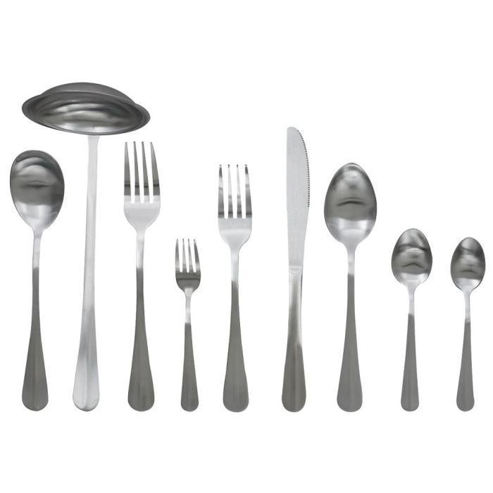 - El set incluye: 6 cuchillos, 6 tenedores, 6 cucharas, 6 tenedores de postre, 6 cucharas de postre, 6 cucharillas de café, 1 cazo, 1 cuchara