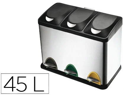 Contenedor fabricado en acero inoxidable con 3 compartimentos de 15 litros cada uno y tapadera de polipropileno. Ideal para clasificar la basura y hacer más fácil el reciclaje. Capacidad: 45 litros. Medidas: 60,5 x 48,5 x 34 cm. Peso: 6 kg.