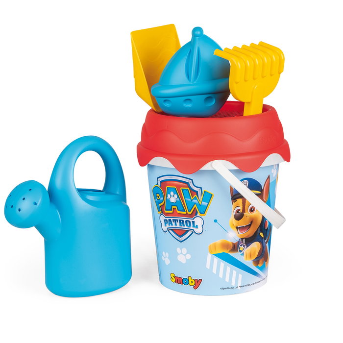 Cubo de playa decorado con Patrulla Canina que incluye cubo, pala, rastrillo, tamiz, molde y regadera.
