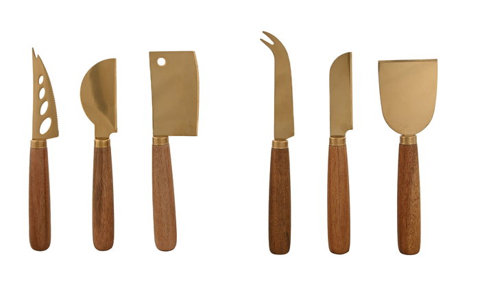 DKD Home Decor Cuchillo para Queso Basicos Dorado Natural Inox Acacia Set 3 Piezas 2 x 17 x 3 cm