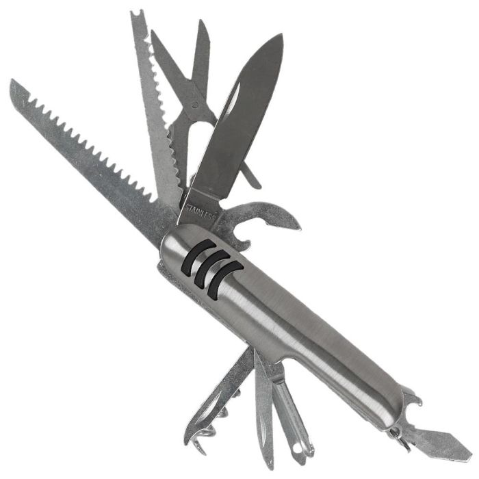 - Con 11 herramientas y accesorios: _ Tijeras _ Cuchillo _ Abridor con destornillador plano _ Sierra _ Abrelatas _ Descamador