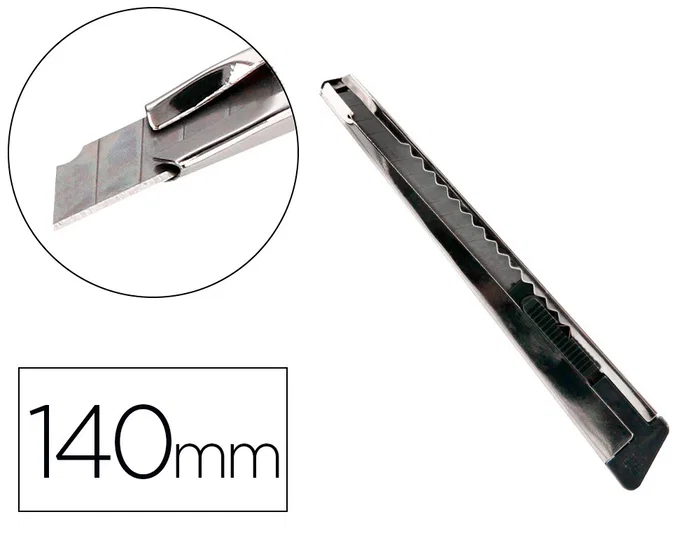 Con freno de seguridad, cuchilla de acero precortado. Cuchilla de 9 mm de ancho. En funda de plástico. Longitud: 140 mm.