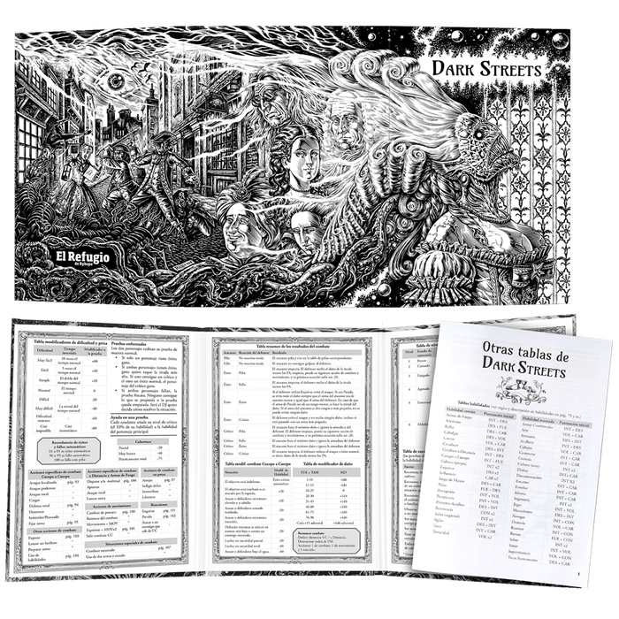 La pantalla del Director de juego para Dark Streets incluye la información y tablas principales del juego para que puedas dirigir tus aventuras en el Londres georgiano. Pantalla del DJ en 3 cuerpos, con ilustración original de Raúlo Cáceres, y un libreto de 16 páginas con el resto de tablas y referencias al manual para facilitar tu labor como DJ. Dark Streets , creado por Peter Cakebread y Ken Walton, es un juego de investigación y terror en el Londres del siglo XVIII, con los Mitos de Cthulhu de fondo. Pertenecéis a los Bow Street Runners, el primer cuerpo policial de Londres, recién creado para hacer frente al vicio, al crimen y a las oscuras fuerzas que amenazan sus calles.
