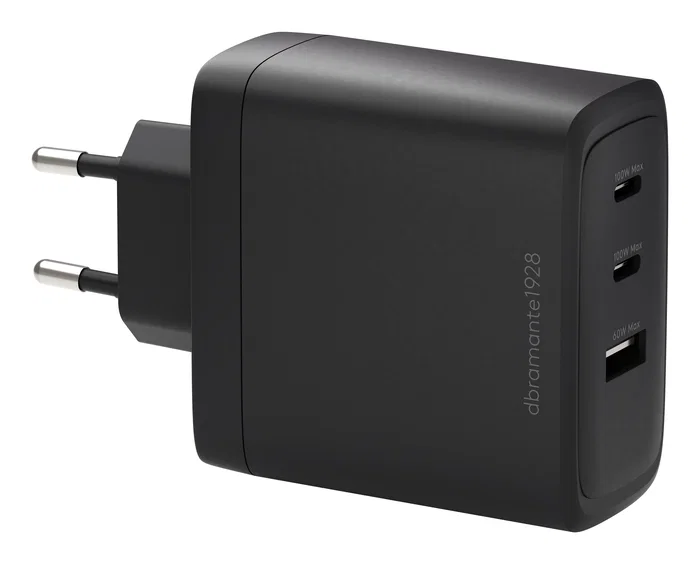 Dbramante1928 CI10EUBL7230 Cargador de Pared 100W USB-C Carga Rápida, 3 Puertos (2x 100W, 1x 60W) para Portátil, Smartphone y Tablet, Negro, Corriente Alterna, Interior