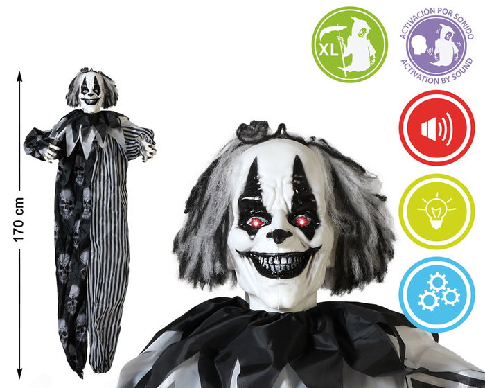 Payaso Asesino Terrorífico con Traje Ensangrentado 160 cm, con Luz y Movimiento Activado por Sonido para Halloween y Fiestas Temáticas