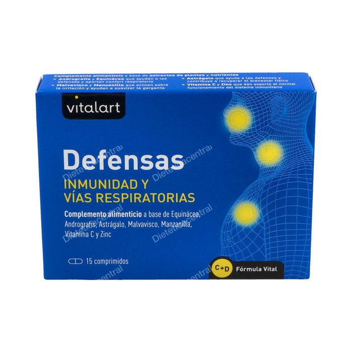 Composicion: Extracto seco de Equinácea (Echinacea purpurea), Agente de carga (celulosa microcristalina), Extracto seco de Andrografis (Andographis paniculata), Extracto seco de Astrágalo (Astragalus membranaceus), N-acetil-cisteína, Ácido L-ascórbico, Extracto seco de hojas de Tomillo (Thymus vulgaris), Extracto seco de raíz de Malvavisco (Althaea officinalis L), Extracto seco de Saúco (Sambucus nigra), Agente de carga (fosfato dicálcico), Antiaglomerante (dióxido de silicio), Extracto seco de Manzanilla (Matricaria recutita), Agentes de recubrimiento (hidroxipropilmetilcelulosa, celulosa microcristalina, ácido esteárico vegetal), Citrato de zinc, Antiaglomerante (estearato de magnesio vegetal), Extracto seco de raíz de Pelargonio (Pelargonium sidoides), Aceite esencial de limón (Citrus limon), Colecalciferol. Por 3 comprimidos: ES de Equinácea (Echinacea purpurea).......912 mg (4% polifenoles) ES de Andrografis (Andrographis paniculata), RDE 5:1.........450 mg ES de raíz de Astrágalo (Astragalus membranaceus Moench)..450 mg (16% polisacáridos), RDE 5:1 N-acetil-L-cisteína....300 mg ES de hojas de Tomillo (Thymus vulgaris) RDE 4:1...250 mg (0,2% timol) ES de raíz de Malvavisco (A. officinalis L.) RDE 4:1........125 mg Extracto seco de bayas de Saúco (Sambucus nigra L.)...100 mg (1% rutina) ES de flores de Manzanilla (Matricaria recutita) RDE 4:1...60 mg Zinc (citrato de zinc)............15 mg ES de raíz de Pelargonio (Pelargonium sidoides) RDE 5-7:1....10 mg Aceite esencial de limón (Citrus limon)......9 mg Fórmula Vital Vitamina C (ácido L-ascórbico)....237,5 mg Vitamina D (colecalciferol)..........7,5 mcg
