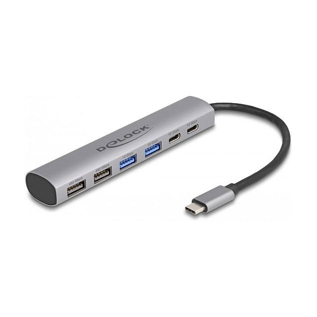 DeLOCK Concentrador USB de 6 puertos con 4 x USB Tipo-A hembra y 2 x USB Type-C hembra, Alámbrico, USB 3.2 Gen 1 (3.1 Gen 1) Type-A + Type-C, Gris, Aluminio, 25 mm, 125 mm