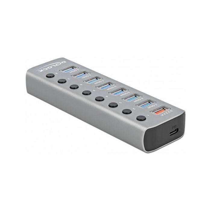 DeLOCK Concentrador USB 5 Gbps con 7 puertos + 1 puerto de carga rápida + 1 puerto USB-C PD 3.0 con interruptor e iluminación, USB 3.2 Gen 1 (3.1 Gen 1) Type-B, USB 3.2 Gen 1 (3.1 Gen 1) Type-A, Gris, 0,8 m, 46 mm, 144 mm