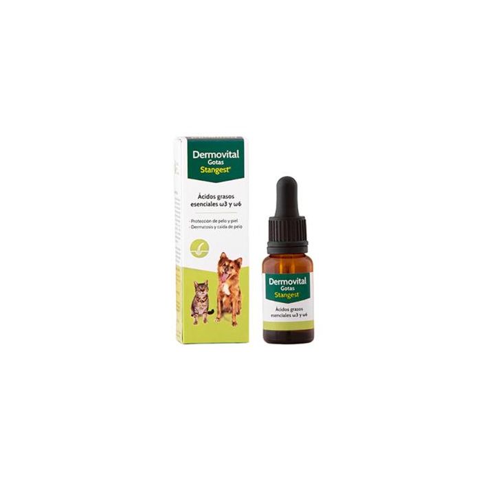 - COMPOSICION Composición: Aceite de Onagra ( Evening primrose oil ) : 99,95%, Vitamina E: 0,05%. Contenido de ácidos grasos por mL: Acido gammalinolénico (GLA): 98 mg. INDICACIONES Dermovital gotas tiene un alto contenido de ácidos grasos esenciales omega 6, que permiten mantener la función dérmica en caso de dermatosis y pérdida excesiva de pelo. El ácido gamma linolénico es una sustancia clave en el crecimiento y desarrollo celular y el mantenimiento de la integridad y funcionalidad de la piel y el pelo. Dermatitis atópica y pruriginosa. Seborrea seca. Alopecia. Pelo áspero y sin brillo. PROPIEDADES: Mejora de procesos inflamatorios y de alerg¡as cutáneas. Regeneración de pelo y piel Mejora de las funciones cardiovasculares y renales. Efecto antiinflamatorios osbre articulaciones. POSOLOGIA Gatos pequeños: 5 gotas/d¡a. Gatos adultos: 10 gotas/d¡a. Perros: 5 gotas/d¡a por Kg de peso.