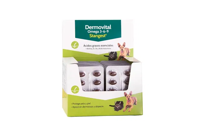 Dermovital Omega 3-6-9 de Stangest contiene una combinación de aceites naturales y vitaminas: Aceite de salmón, Aceite de borraja, Aceite de oliva, Vitamina E y Biotina.