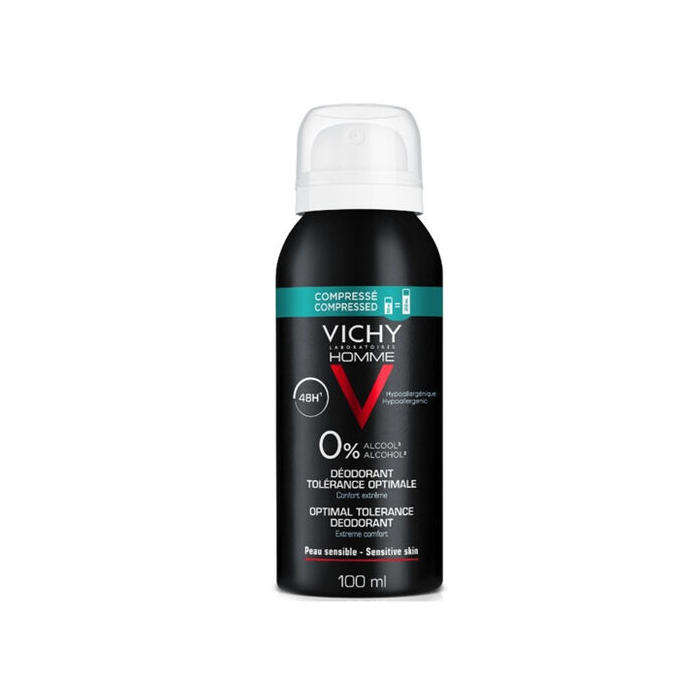 Descubre el HOMME Tolérance Optimale Sensitive Deo Vaporizador de Vichy Laboratoires, un desodorante en spray especialmente diseñado para hombres. Ofrece una protección duradera de hasta 48 horas, siendo hipoalergénico y formulado con 0% de alcohol, ideal para pieles sensibles. Su envase ecocomprimido es reciclable y reduce el material en un 32%, conteniendo 100ml de producto que rinde como 200ml. Disfruta de una fórmula sencilla y minimalista que proporciona confort y frescura durante todo el día.
